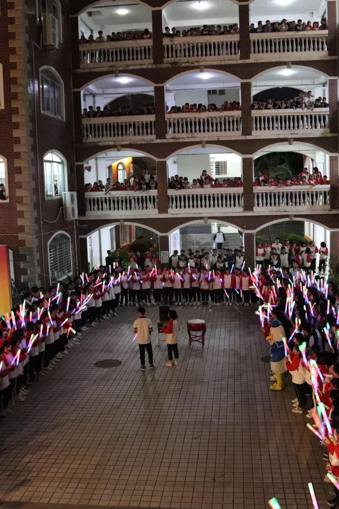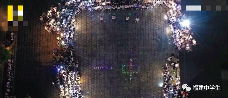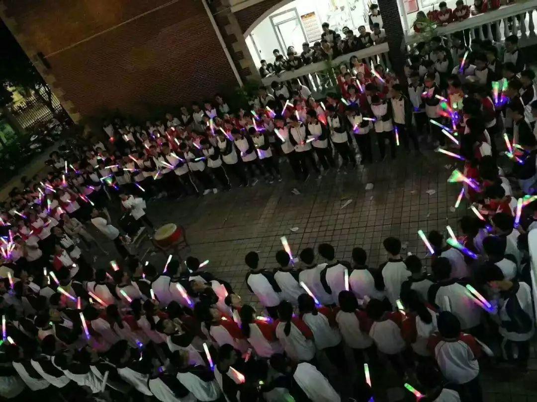 泉州一中近千名高一高二的学生面对高三教学楼,举着荧光棒,为高三学子加油助威。活动持续了大约半小时,现场气氛高涨,大家还一起合唱了歌曲《夜空中最亮的星》,互相加油鼓劲!