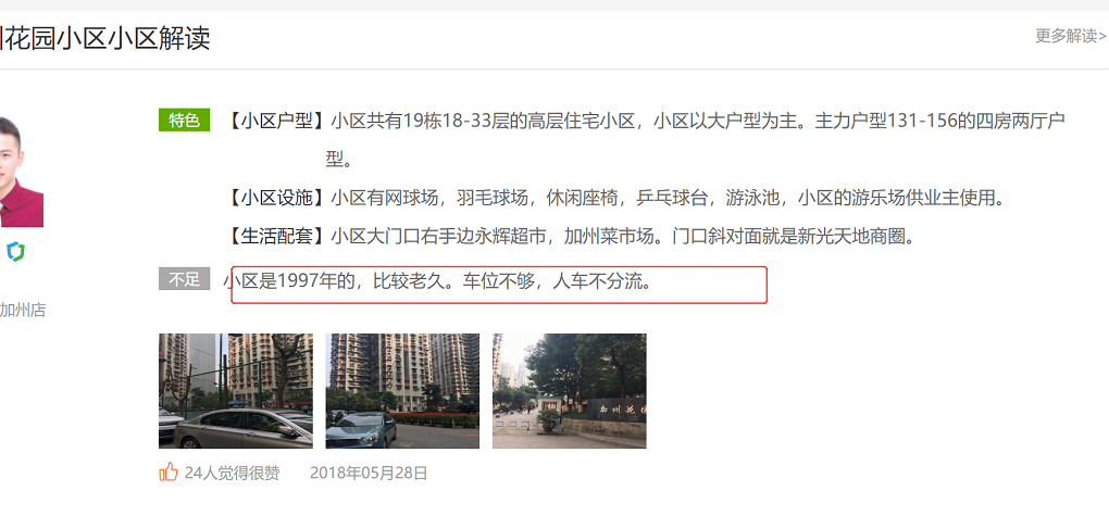 市界通过一家房产交易网站发现,重庆渝北区加州花园位于重庆市渝北区红锦大道。开发商是重庆中渝物业发展有限公司,物业公司为重庆中渝物业管理公司。小区总户数3717户,总建筑面积达530000平方米,建成于1997年,年代较为久远。多名业内人士在网站点评,该小区车位不够,人车不分流。