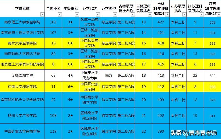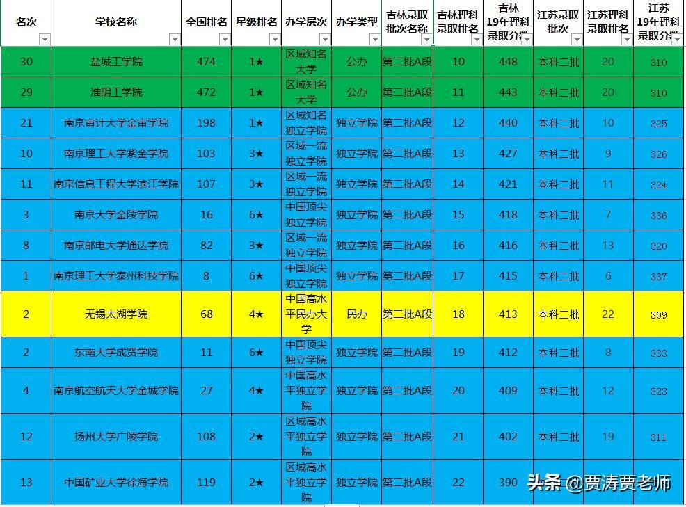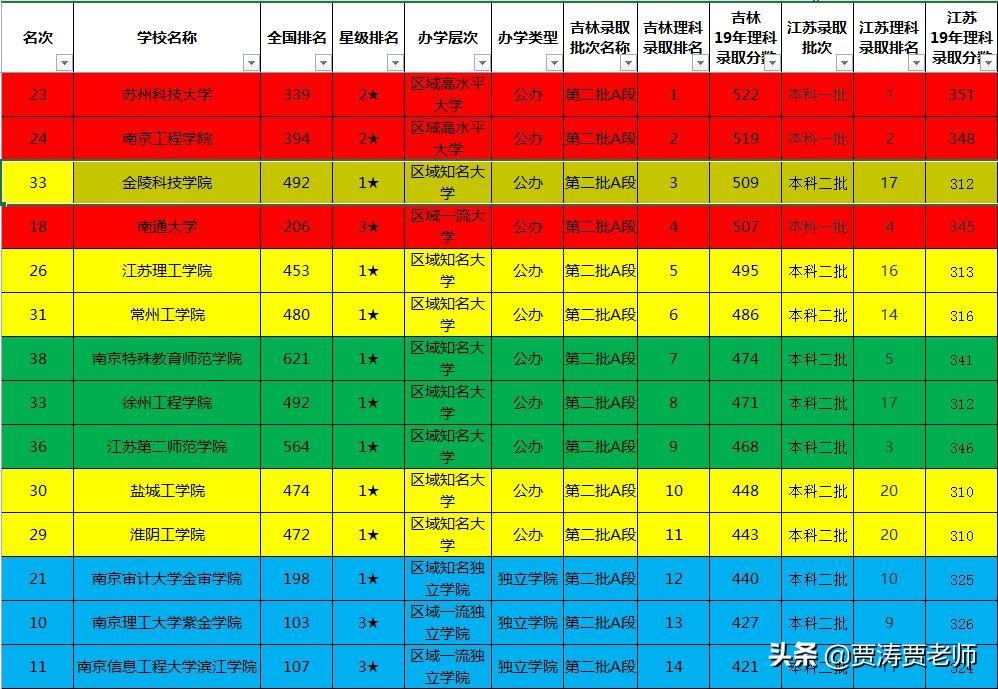 声明:本文只进行在吉林省招生的江苏院校,对于不在吉林招生的院校,没有涉及哈。并且,由于篇幅所限,本文只对理科招生院校的2019年数据进行了分析,大家如果想要文科或其它年份的资料,可以关注@贾涛贾老师,私信@贾涛贾老师呦。