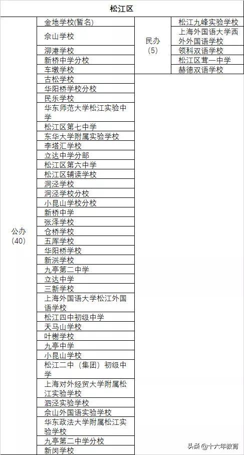 强校工程实验校:松江二中(集团)初级中学、松江四中初级中学、泖港学校、松江区第六中学、佘山学校、华东师范大学松江实验中学、新桥中学、立达中学、叶榭学校、小昆山学校、新浜学校