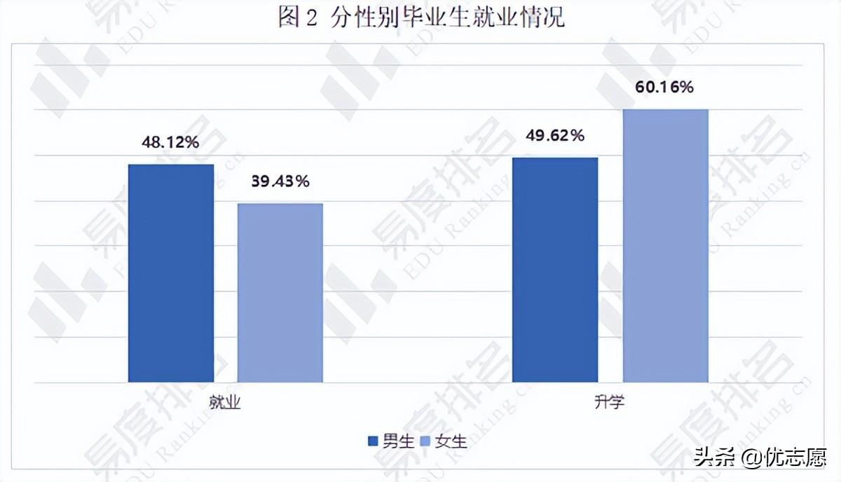 图2给出了不同性别就业和升学情况,可以看出男生就业率要高于女生,女生更加倾向于升学,其升学率高达60.16%。