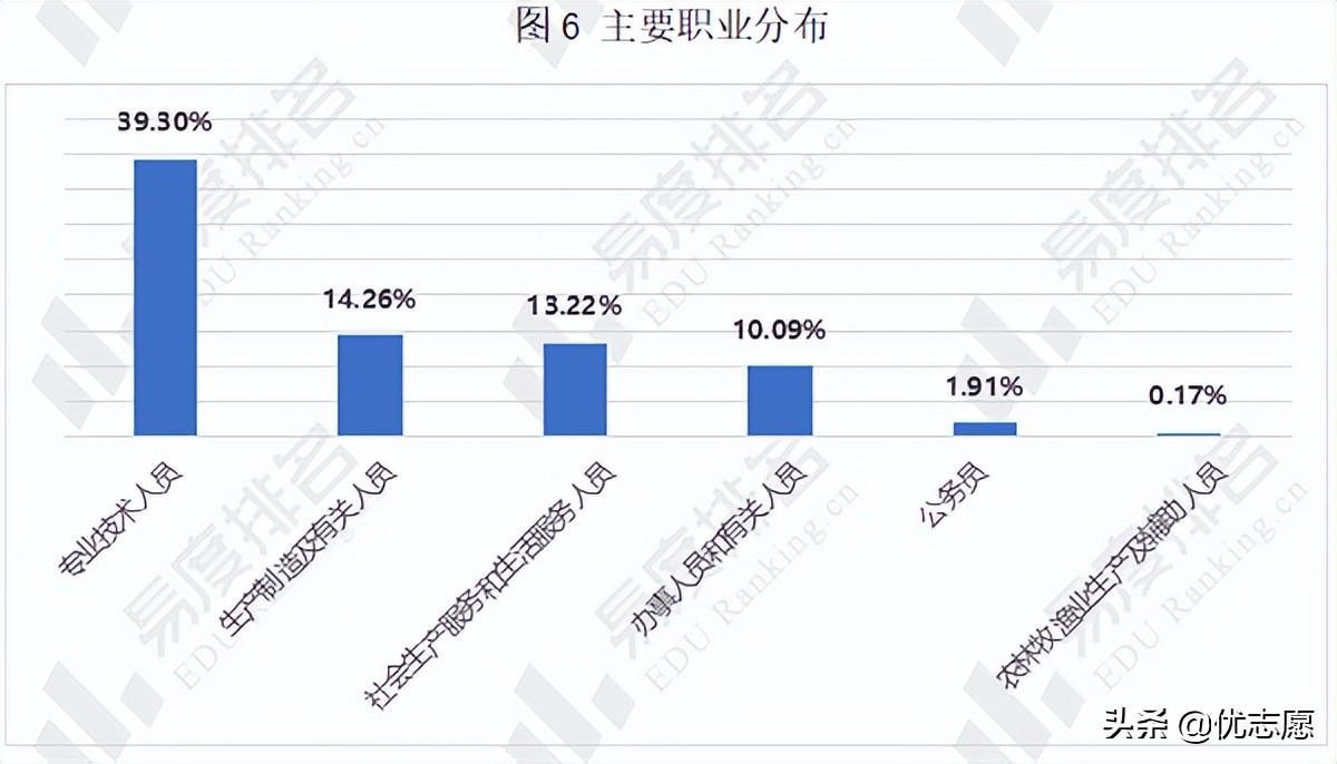 毕业生主要从事的职业为专业技术人员(39.3%),其次为生产制造及有关人员(14.26%),以及社会生产服务和生活服务人员(13.22%)。