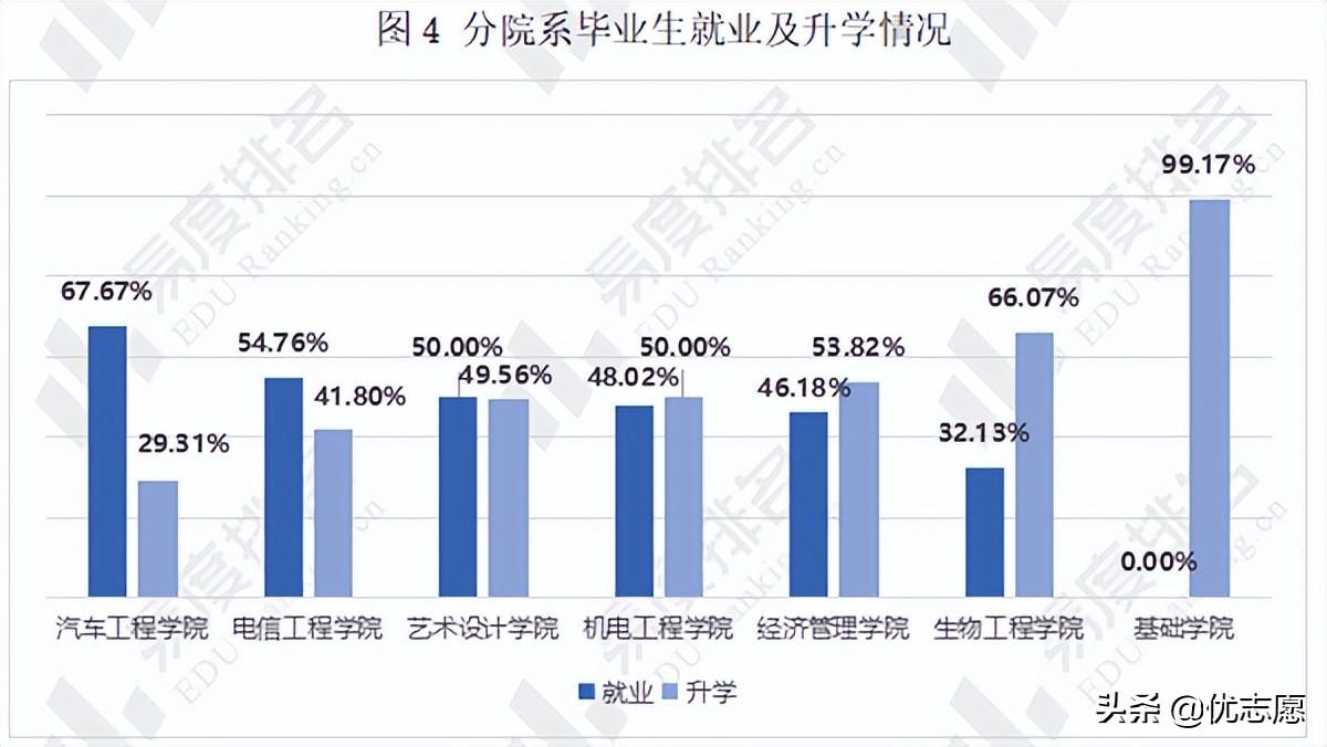 图4给出了不同院系毕业及升学情况。汽车工程学院、电信工程学院和艺术设计学院就业率高于升学率,其他院系升学率高于就业率,其中基础学院毕业生除待就业外,其余毕业生全部升学,经济管理学院毕业生去向落实率达到100%。