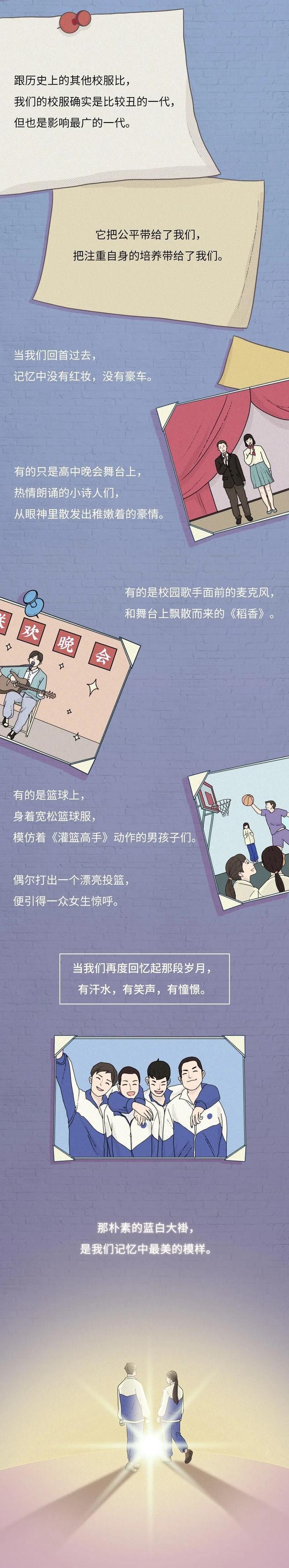 结语:每一套校服都见证了我们美好的童年和每一个年龄段的成长历史,所以校服是值得珍藏的,看到儿时穿的校服,总会有一种莫名的亲切,也会突然想起在校园时光里的美好记忆,这是我们永远世界的青春,希望大家都能铭记于心。