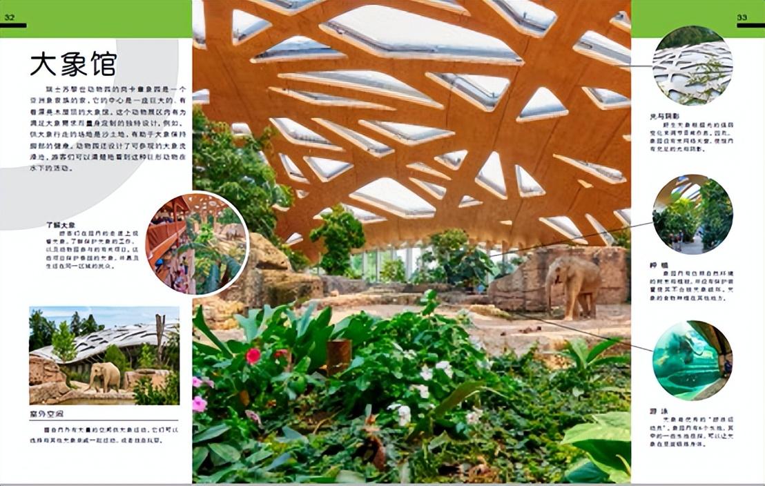 你看透光的阳光屋顶,是为了光能够自然直射,这样大象就可以根据光的变化来调整自己的作息。要容纳这一群大家伙,它们的场馆必须足够大而坚固。大象和你一样喜欢踩在软软的沙地上,这对于它们的宽大的脚是一种保护。大象也喜欢室外活动,因此这个大象馆设计了一半室内一半室外。