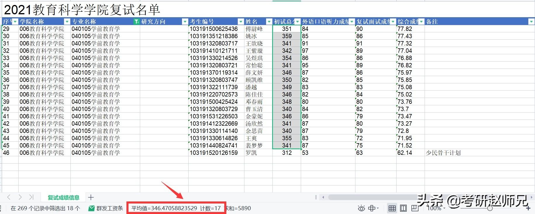 复试总共进入18人,除去一个少民计划,统招17人,最低分340分,平均分346