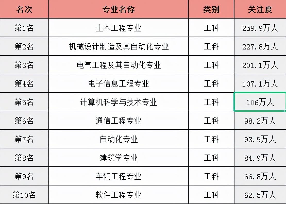 第四名、第五名和第六名是电子、计算机领域的专业,其中电子信息工程和通信工程专业更倾向于信息传递的硬件发展,而计算机科学与技术更倾向于编程计算,例如云计算、人工智能等等,在学习的过程中,这三者学习内容的区别很小,所以在关注度上也十分接近。