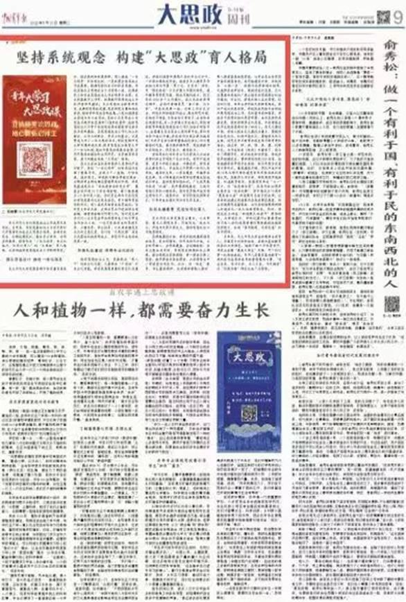 5月10日,《中国青年报》9版大思政专版头题刊发了东北师范大学党委书记杨晓慧撰写的题为“坚持系统观念 构建‘大思政’育人格局”的文章。文章从强化顶层设计、加强队伍建设、抓好关键要素三方面,结合此次校园疫情防控工作,阐述了学校探索形成的“一体化领导、专业化运行、协同化育人”的“大思政”育人格局,学校思想政治工作取得实实在在的成效。