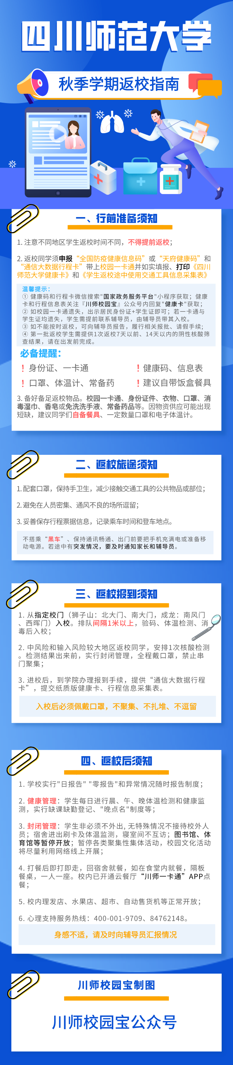 1.按计划返校的学生须主动出示学生证或四川师范大学校园卡(即“一卡通”)、防疫健康信息码,并接受查验和体温检测。