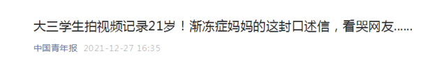 南京林业大学大三学生张浏浏用镜头记录下他的2021年,视频中他回顾了自己的21岁,记录了这一年他对身患渐冻症妈妈的照顾与陪伴,其中,他的妈妈的口述信,也让无数网友动容。