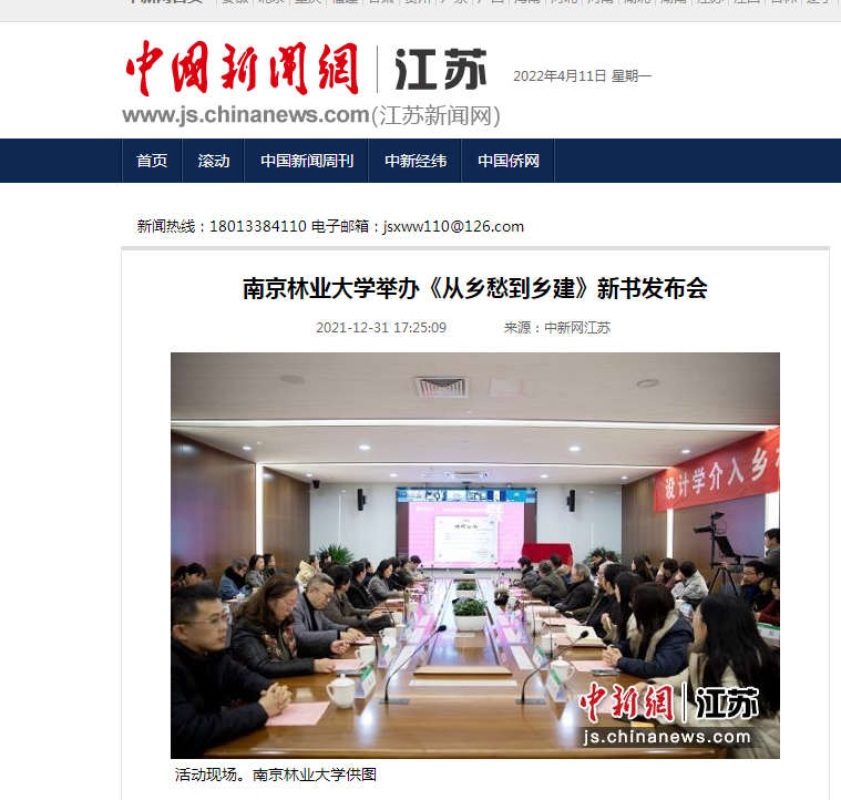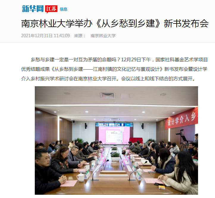 国家社科基金艺术学项目优秀结题成果《从乡愁到乡建——江南村镇的文化记忆与景观设计》新书发布会暨设计学介入乡村振兴学术研讨会在南京林业大学举行。该成果对当前江南乃至全国的村镇建设和乡村振兴全面实施具有一定的学理支撑和实践参照价值。在设计学介入乡村振兴学术研讨会上,与会专家对研究成果给予了高度肯定,认为这拓展了“新文科”视野下的设计学科发展思路,对设计学赋能乡村振兴具有积极的指导意义。