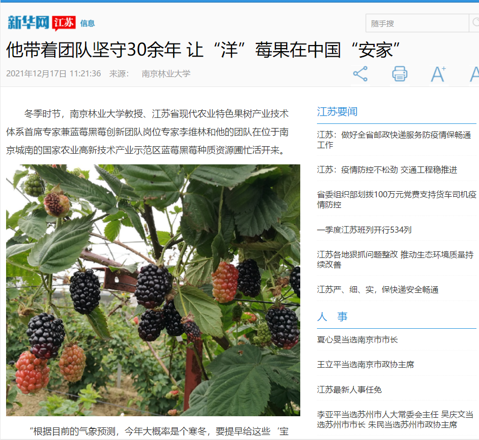 南京林业大学教授、江苏省现代农业特色果树产业技术体系首席专家兼蓝莓黑莓创新团队岗位专家李维林为了让“洋莓果”深深扎根中国大地,李维林和他的团队坚守了30余年。冬季时节,李维林教授和他的团队在位于南京城南的国家农业高新技术产业示范区蓝莓黑莓种质资源圃忙活开来。