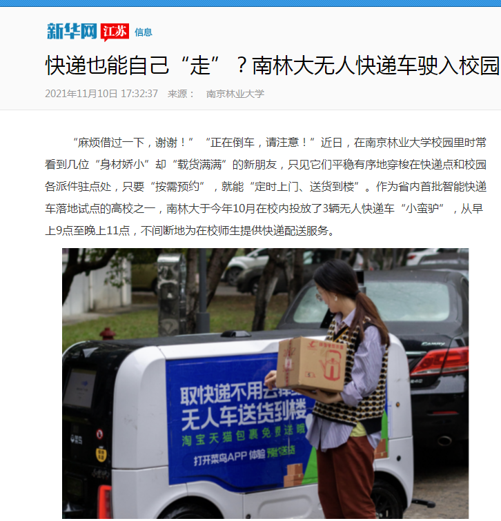 作为省内首批智能快递车落地试点的高校之一,南京林业大学于2021年10月在校内投放了3辆无人快递车“小蛮驴”,从早上9点至晚上11点,不间断地为在校师生提供快递配送服务。无人快递车是一项校企合作民生工程,后期学校还将对校园快递服务实行全面统一规范管理,在维护校园良好秩序的同时,也为广大师生提供更加周到优质的服务。