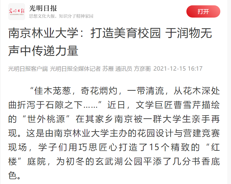 在南京林业大学主办的花园设计与营建竞赛中,学子们用巧思匠心打造了15个精致的“红楼”庭院,为初冬的玄武湖公园平添了几分书香底色。南京林业大学正在加紧落实《教育部关于切实加强新时代高等学校美育工作的意见》,通过打造人人皆学、处处能学、时时可学的“大美育模式”,让美育精神浸润校园每一个角落。