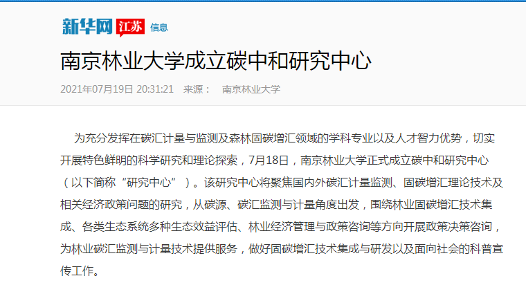 2021年7月18日,南京林业大学正式成立碳中和研究中心。该研究中心将聚焦国内外碳汇计量监测、固碳增汇理论技术及相关经济政策问题的研究,从碳源、碳汇监测与计量角度出发,围绕林业固碳增汇技术集成、各类生态系统多种生态效益评估、林业经济管理与政策咨询等方向开展政策决策咨询,为林业碳汇监测与计量技术提供服务,做好固碳增汇技术集成与研发以及面向社会的科普宣传工作。