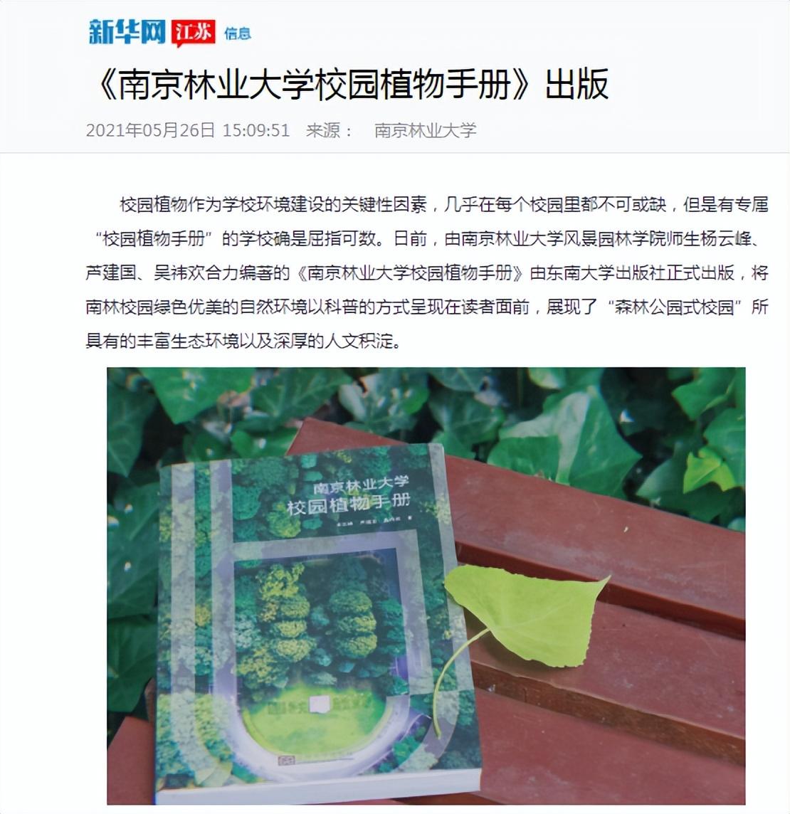 由南京林业大学风景园林学院师生杨云峰、芦建国、吴祎欢合力编著的《南京林业大学校园植物手册》由东南大学出版社正式出版,将南林校园绿色优美的自然环境以科普的方式呈现在读者面前,展现了“森林公园式校园”所具有的丰富生态环境以及深厚的人文积淀。