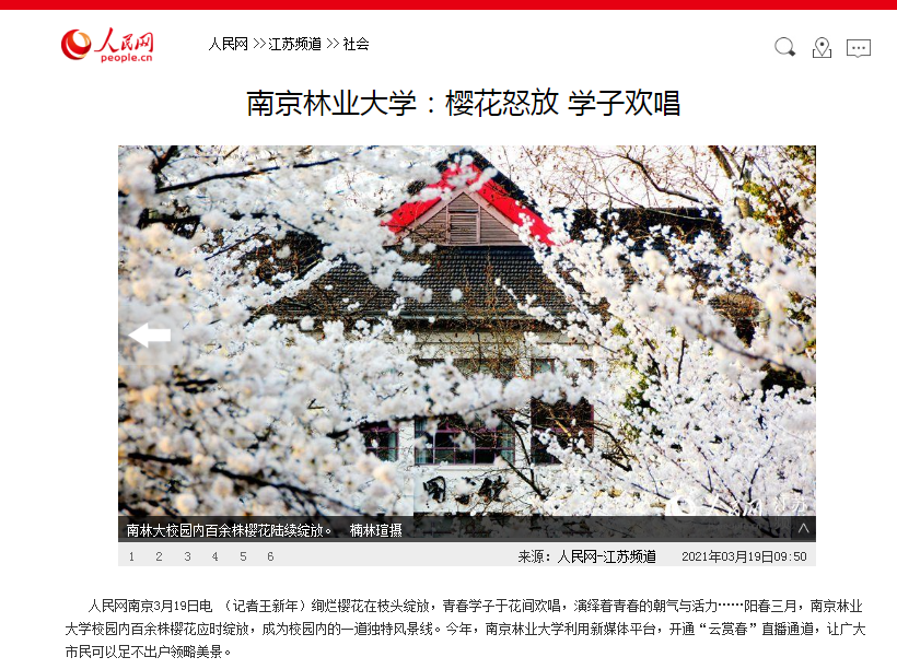 阳春三月,南京林业大学校园内百余株樱花应时绽放,成为校园内的一道独特风景线。2021年,南京林业大学利用新媒体平台,开通“云赏春”直播通道,让广大市民可以足不出户领略美景。
