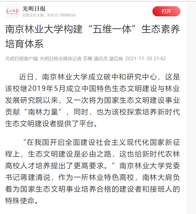 近年来,南京林业大学构建“五维一体”生态素养培育体系,着力培养具有生态理念、生态思维和绿色技能的生态文明建设者,为国家输送了一批批满怀生态情怀的人才。