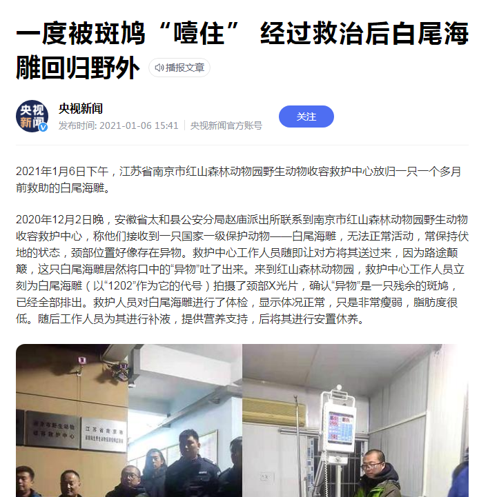 2021年1月6日,红山森林动物园和南京林业大学生物与环境学院鲁长虎教授动物生态学实验室的学者们合作,放归一只一个多月前救助的白尾海雕。南林大学者们之前为苍鹰,红隼,赤腹鹰安装过GPS追踪器,此次也是他们第一次为白尾海雕安装GPS。