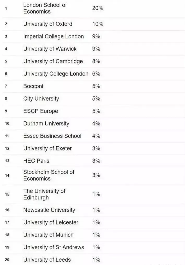 相对在QS排名中更靠前的牛津和剑桥,LSE(伦敦政治经济学院)在金融圈各大名气的target school中似乎更占优势。