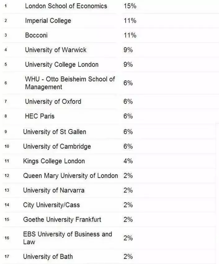 相对而言,在纽约的投行新人们就读的学校范围更广,而LSE、牛津大学、帝国理工学院和纽约大学斯特恩商学院则是英国投行招聘官最为青睐的地方。此外,不少欧洲其他国家顶尖商学院的学生也是伦敦金融城的宠儿。