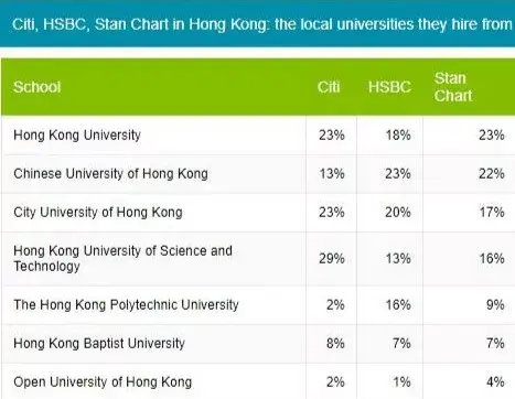 香港大学、香港科技大学、香港中文大学、香港城市大学这四所大学出身的从业者占据了香港投行88%的席位。