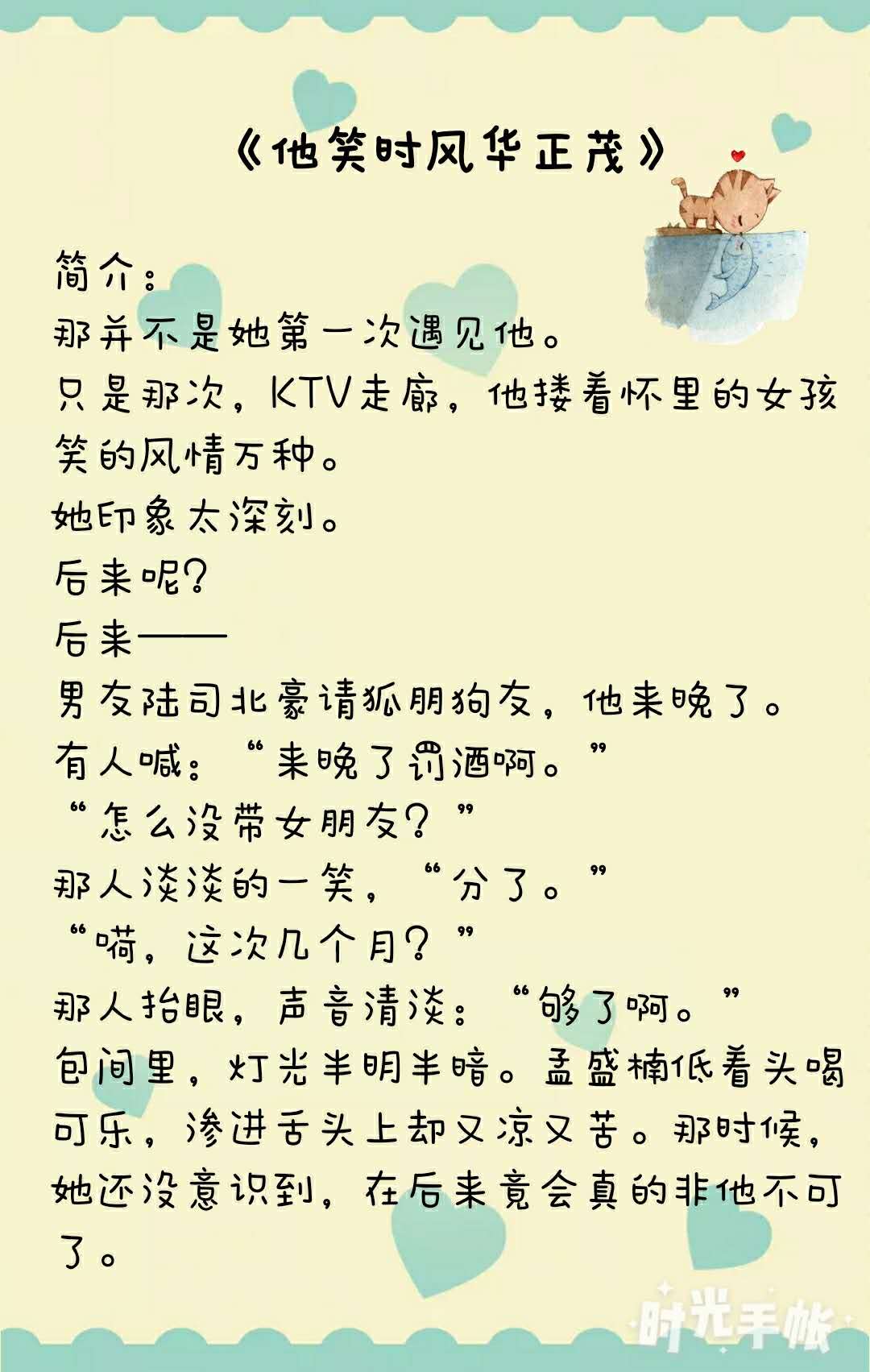 短评:暗恋文,女主很早以前就喜欢男主,男主是校园风云人物,风流的那种,妖孽…学生时期着墨不多,与成年时期穿插描述,并不突兀。男女主后来相逢时,男主才开始注意到女主,老司机撩女主,发现对方暗恋自己后就开车了!emmm,虐的点除了暗恋,还有女主重遇男主后那说不清道不明想靠近又害怕的心酸劲儿。好在后来很甜,虐过后的甜真是苦尽甘来啊。有肉。满意~