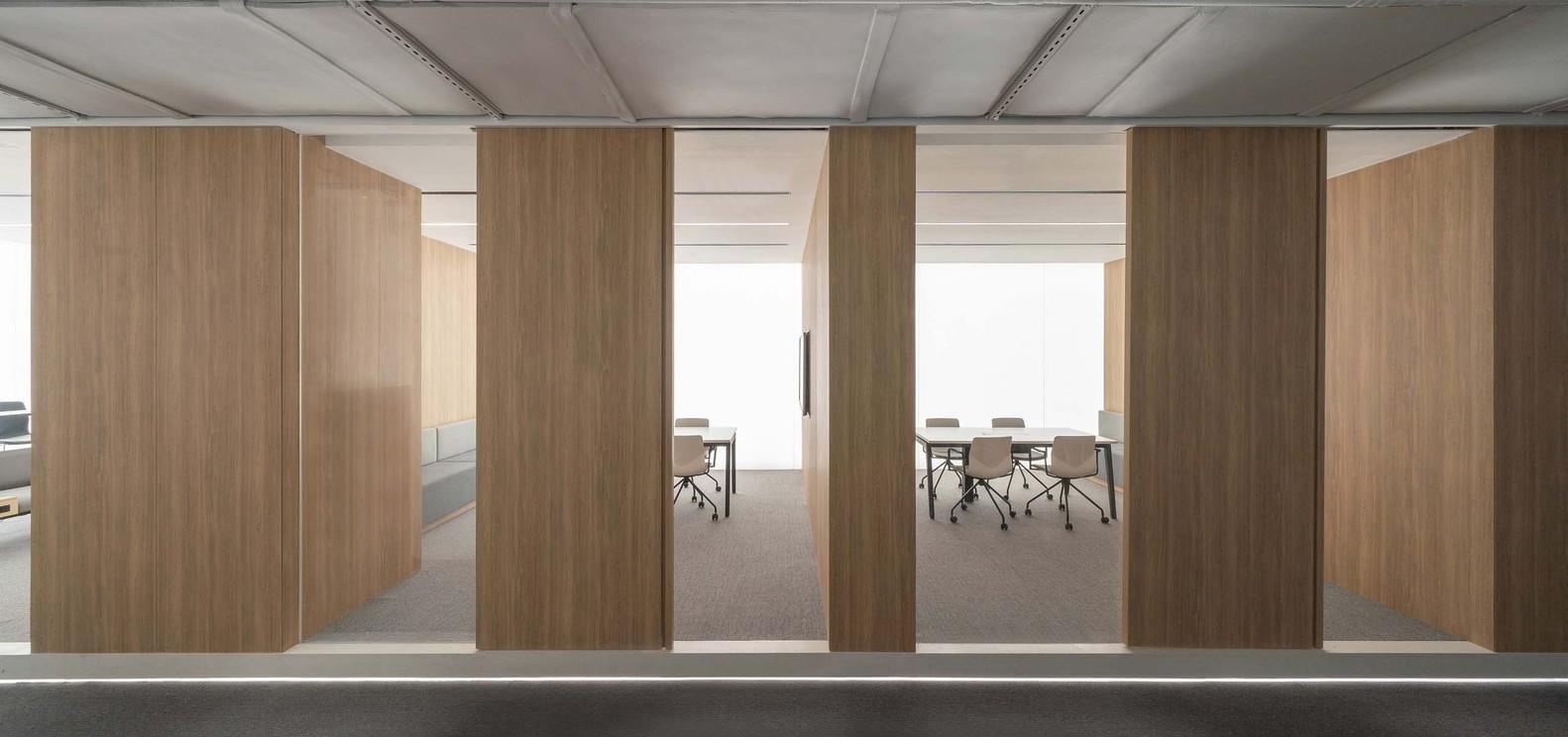 同时我们将“星系”概念融入到空间当中,试图将信息科技与艺术装置融入该项目,呈现出神秘、科幻的空间印象。休息区处,我们将星球微缩后置入墙面作为悬浮球展示,仿佛呈现了一个微缩的宇宙,讲诉着星球的历程。镜面天花凹陷处屏幕展示九毛九文化同时作为黑洞的概念输出,贴合星系主题概念。秩序与自由、理智与文明,在大堂通往办公区的通道中运用材质与氛围光的结合,仿佛营造出另一个精神世界。来到一个办公空间,我们想与大堂拉开差距,更加轻松/智能。我们置入“玻璃盒子”作为会议室墙体隔断,盒子内部设置灯光,形成大面积的人工照明满足办公所需,也可作为书写的载体。