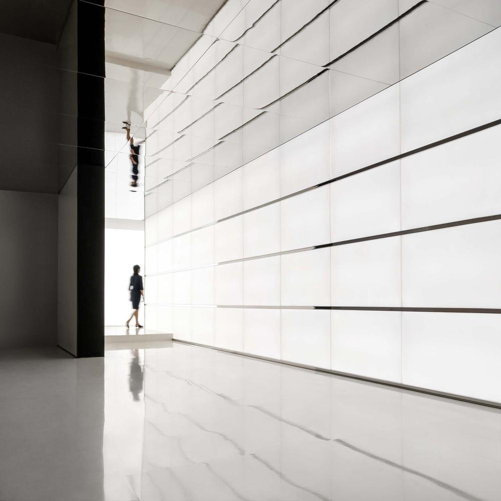 大堂内部首先需要打破层高的束缚,为此我们将镜面不锈钢覆盖在大堂的天花上,使得空间看上去更加的通透,以轴线的无限延展,带来具有冲击力的视觉印象。在大堂处置入了一个10米长的石材体块作为接待台,并在整个前台背景墙铺满了亚克力发光模组,使光线本身成为主角而不是媒介,该方式使得观看者的空间感知概念变得扭曲,因为他们所处的环境似乎无穷无尽;天花的镜面不锈钢结合墙面的亚克力发光模组,通过空间延伸以营造出停留在宇宙中的空间站氛围感。前台背景由88块亚克力发光模组组成,每块都可单独控制明暗且拆卸维修。
