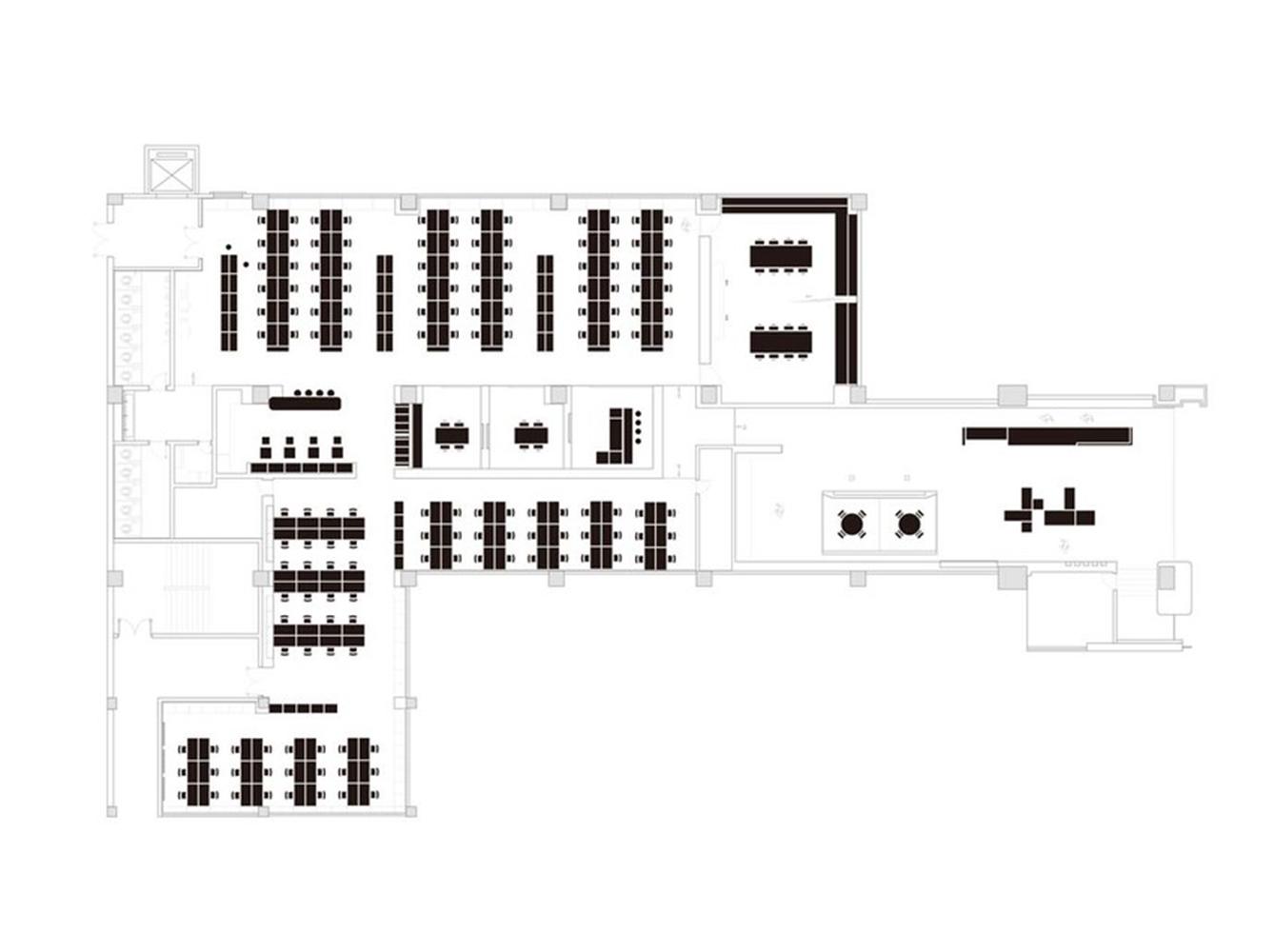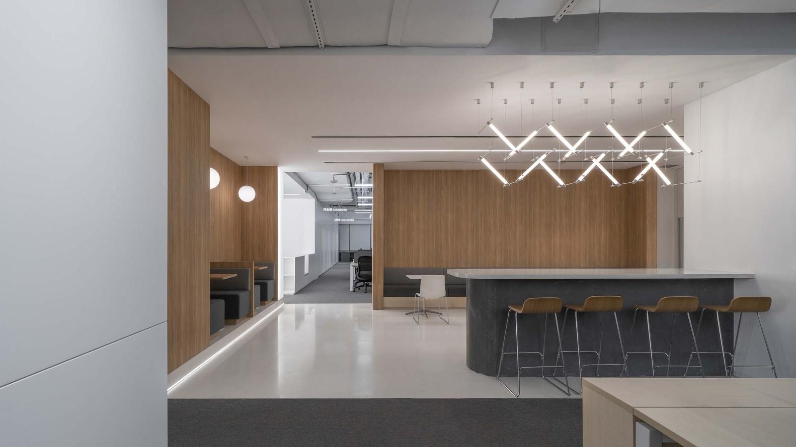 办公内部基本都是开放空间,需要容纳100+的卡位,我们在空间中置入三个柜体将卡位进行分割,柜体通过几何窗口令不同区域的工作者保持自身空间舒适度的同时也保持视线上的情感和需求连接,柜体用不同的几何形体开口形成不同的功能用途,如展示柜、卡座、吧台等.将“工作场所”转变成舒适的“生活空间”,我们希望能够给予空间更多的内部可塑性与可能性,毕竟,“星系”中还有很多“星球”等着九毛九去发现……