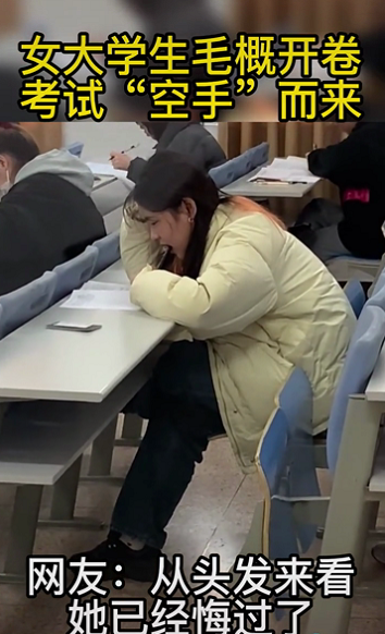眼前就有一位,浙江嘉兴的一名女大学生,期末考试考毛概没带书。周围的学生都在翻着书,优哉游哉的答题,这名女生把头发抓成了拖布,也没能改变没有书的命运。