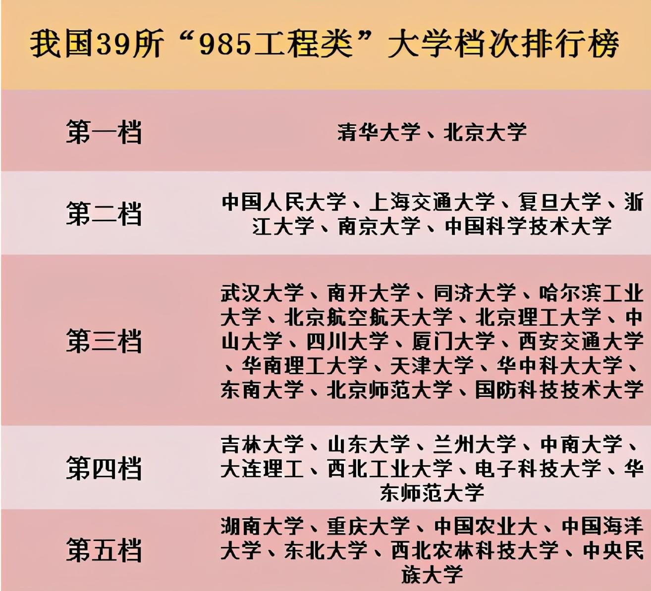 985高校“档次”排名,一共分为5个档次