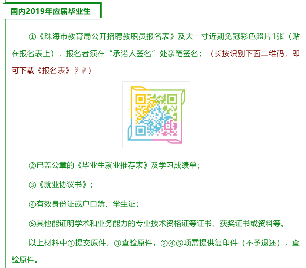 ①《珠海市教育局公开招聘教职员报名表》(点击“阅读原文”查看)及大一寸近期免冠彩色照片1张(贴在报名表上),报名者须在“承诺人签名”处亲笔签名;