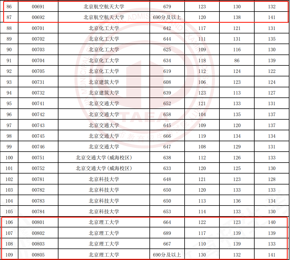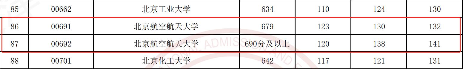 排在第十位的有两所高校,分别是北京航空航天大学和西安交通大学,两校的最低投档分都是670,其中西交只有一个招生代码,而北航有2个招生代码,另一个招生代码的提档分数是690分及以上。