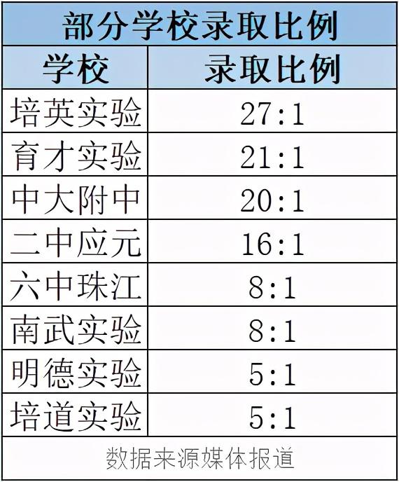 其中中大附中竞争最为激烈,录取比例超过20:1,此外6中珠江中学和南武实验的录取比率也达到8:1