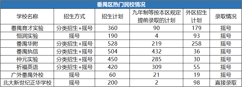 经统计,广州市番禺区广东外语外贸大学附设番禺外国语学校、广州市番禺区恒润实验学校、广州市番禺区华南碧桂园学校、广州市番禺区剑桥郡加拿达外国语学校、广州市番禺区明德广地实验学校、广州市番禺区祈福英语实验学校、广州市番禺区香江育才实验学校、广州市番禺区新英豪中英文学校、广州市番禺区执信中学、广州市番禺区仲元实验学校、广州市华师附中番禺学校共11所民办小学1271个学位(其中区内招生计划642个,跨区招生计划629个)需要进行电脑抽签确定入读名单。录取率为23.19%。