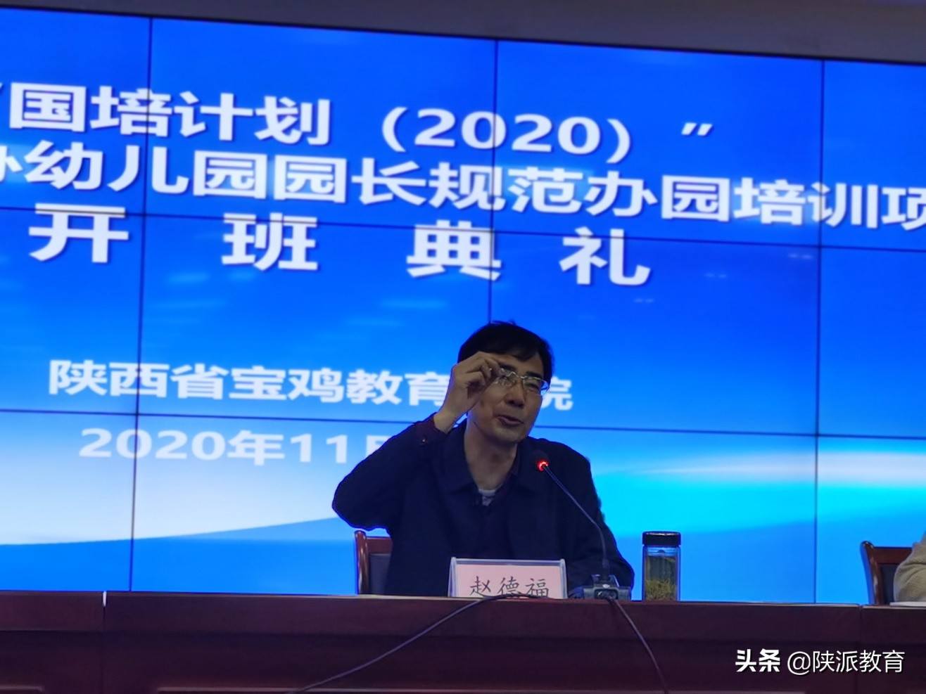 典礼上,宝鸡教育学院院长赵德福做讲话,分析了国家出台的一系列教育政策,介绍了学院在国培培训中取得的成绩和经验。他指出,学院对本次培训高度重视,科学统筹,力争强化培训的实践性、精准性和科学性。他强调幼儿园园长长期执着于孩子的事业,奏响了幼儿教育之歌。新时代有新的使命,大家要不忘初心,不断提高自己的综合素质与能力。赵院长对学员提出了三点希望;一是站在国家的立场、人民的立场、党的立场,科学保教,规范办园。大家要树立教育情怀,关注教育前沿,规范幼儿园教育,创新幼教发展思路。二是要时刻树立终身学习目标,更好地引领幼儿教师队伍建设。新时代新教育,对幼儿教师提出了更高的要求,大家更要不断地提高自身的境界,懂得全纳教育。三是要学以致用,着力克服幼儿园教育"小学化"的倾向。坚持理论联系实际,努力把自己锻炼成为一名肯干、敢干、善干的园长,在幼教这个舞台上体现人生价值,为全省幼教事业的改革与发展做出更大的贡献。