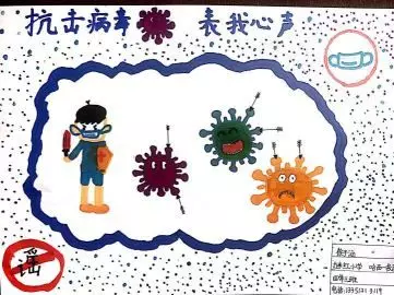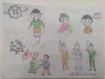 这幅作品用四格漫画的方式,描绘了我们从初遇病毒时的恐慌无助,到了解病毒后的积极预防,再到抗击病毒时的万众一心,最后击败病毒的胜利喜悦。简洁的笔法,生动的形象,图文并茂的描绘了这场战“疫”的各个环节,表达出小作者对我们一定能战胜疫情的坚定信心。