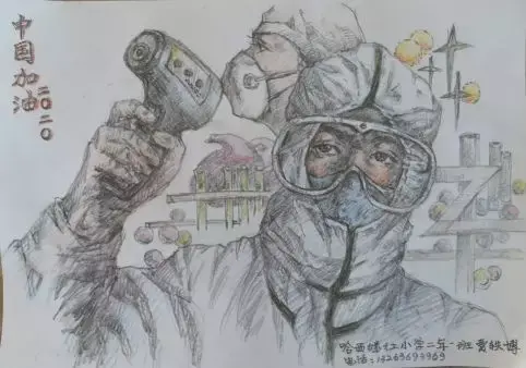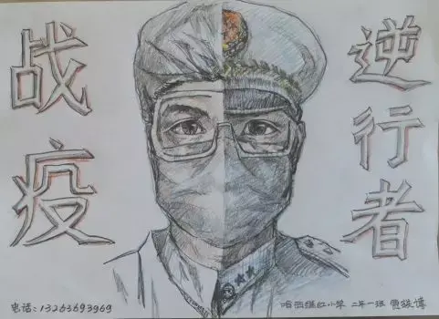 两幅作品用细腻的笔法,精妙的构思,着重表现了在这场没有硝烟的战斗中最可敬的人一一医生和警察。图一,抓住帽子、护目镜、领章等突出特征,巧妙的将二者形象合二为一,尤其是细致入微的眼神刻画,更是让我们充分感受到了这些逆行者们的坚定与信心。图二,栩栩如生的描绘了全副武装的医护人员,目光坚定的医生、表情温柔的护士富有科技感的背景,让我们感受到医务工作者们正全力以赴抗击病毒、全情投入研究治疗方法,相信在勇士们的努力下,我们一定能战胜疫情,让我们一起为他们为中国加油!