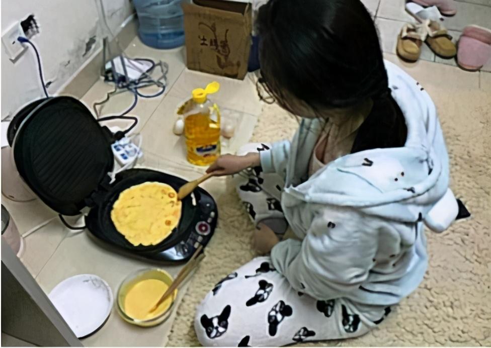 女生宿舍中除了最普通的电夹板和吹风机这种大功率的电器之外,事实上这只不过是小儿科而已。虽然电夹板和吹风机功率是不能够在宿舍,在宿舍使用的,毕竟有可能会有安全隐患,但是一山更比一山高,一位女生竟然买了一个电饼铛,竟然安安心心的盘腿坐在地上摊起了鸡蛋,要知道吹风机这种小功率的电器都用不了,更何况这种大功率电器呢,简直是拿宿舍安全不当回事。