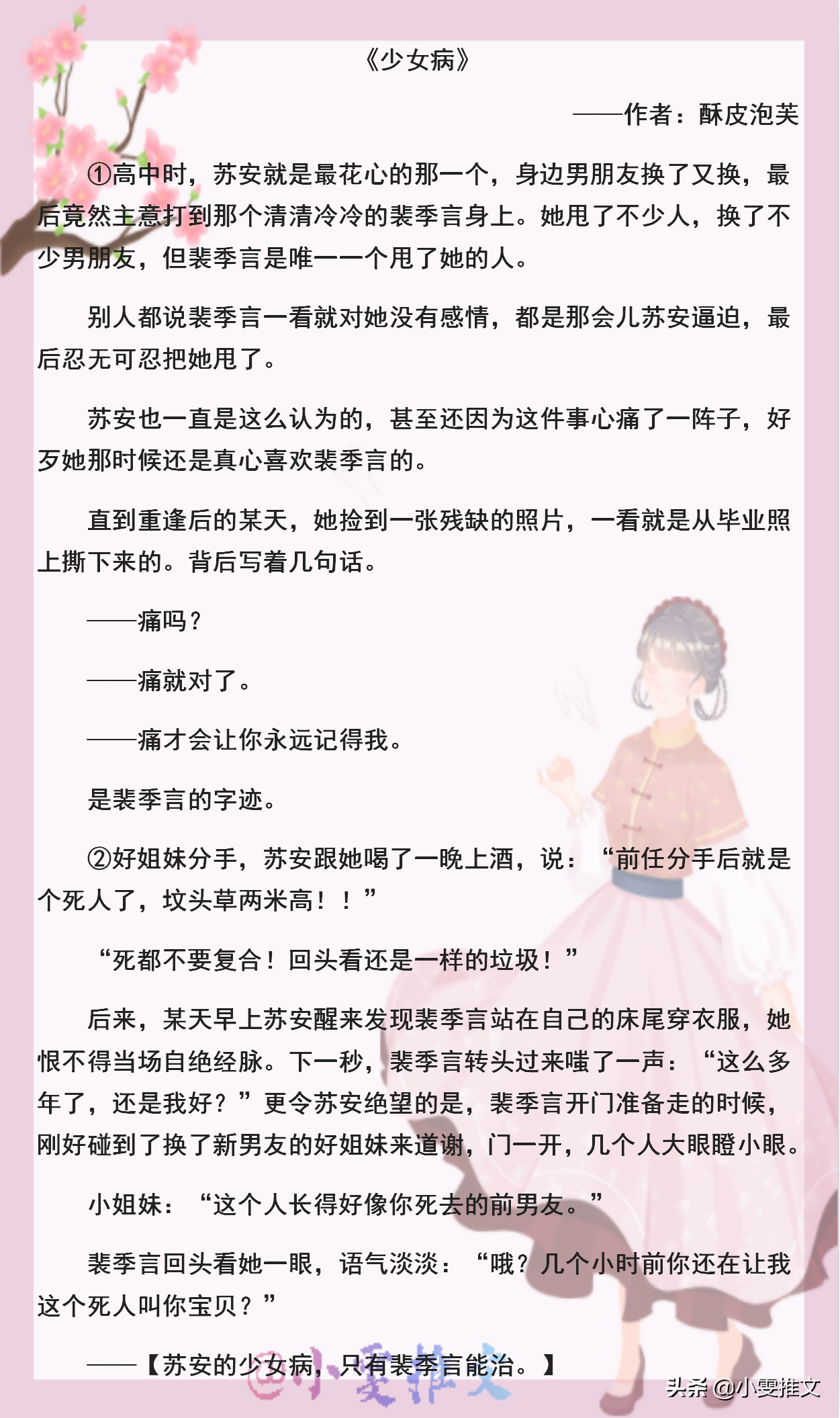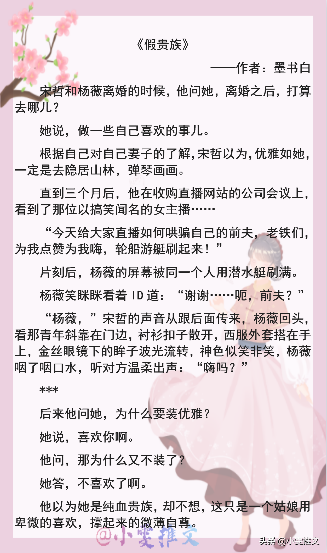 简评:作品讲述了家境贫困的少女杨薇在母亲去世后被豪门宋家收养,与男主宋哲青梅竹马长大,而后家族安排结婚,经历三年冷暴力婚姻后离婚,阴差阳错投入直播事业中寻找自我,与宋哲破镜重圆的爱情故事。以两人感情为线索,展现了两个人的性格成长,傲慢公子学会责任平和,自卑少女寻求自我和本真。作品语言风趣,情节跌宕起伏,感情刻画细腻有层次,男主从离婚、后悔、意识到爱、为爱放下、为爱成长的感情线逐步递进,将虐妻一时爽追妻火葬场的核心展现得淋漓尽致,虐中带爽,爽中带暖,让故事整体基调起于情节上的爽虐,升华于主人公内心的成长和圆满。而女主事业线新颖生动,刻画有趣,是一篇元素完整,高潮迭起,共情能力极强的催泪佳作。