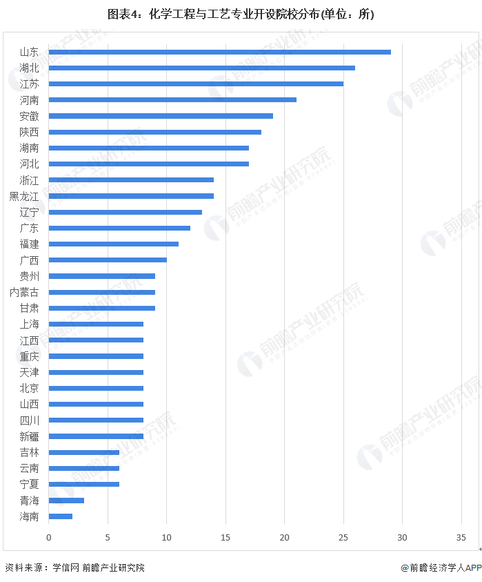 4、化学工程与工艺专业开设院校分布:以山东为主