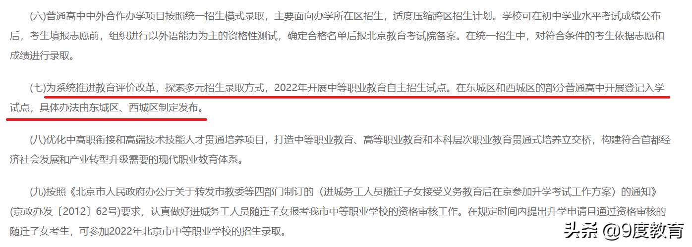在3月19日北京教委发布的《北京市教育委员会关于做好2022年高级中等学校考试招生工作的意见》中,提到在东城区和西城区的部分普通高中开展登记入学试点。