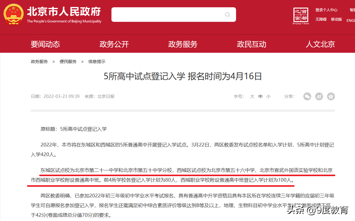 3月22日,东城区和西城区试点高中登记入学的5所学校被公布,5所高中计划登记入学计划420人。