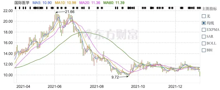 2021年以来,国际医学接待了不少机构调研,其中公募一哥张坤2021年的首次调研,便选择了国际医学。2021年上半年国际医学的股价一路抬高,2021年6月2日走出了有史以来的最高价,21.66元/股,要知道一年前的4月28日,国际医学还是一支仅3.92元/股的个元股。