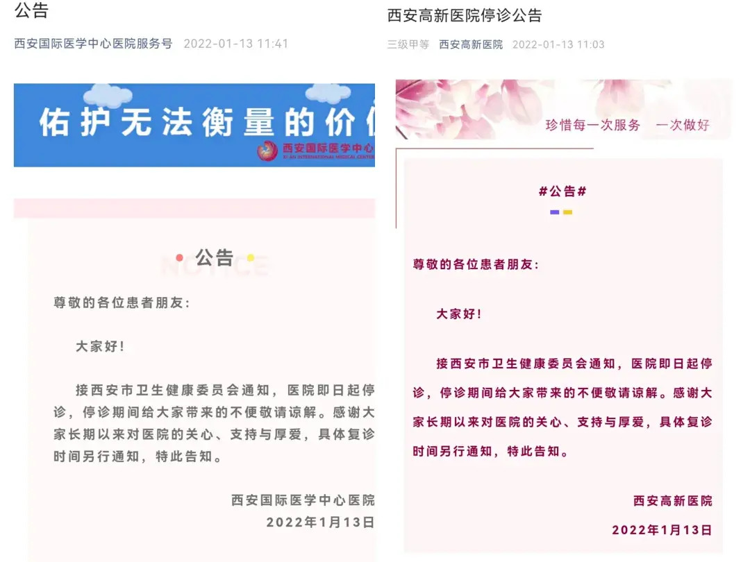 《通告》发布后,西安高新医院和西安国际医学中心医院服务号在公众号内发布停诊通知公告。