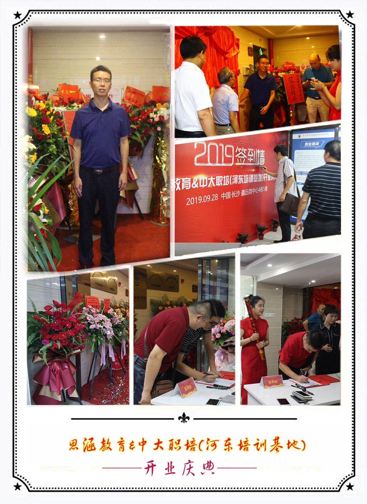 2019年9月28日,思涵教育&中大职培(河东培训基地)开业庆典在长沙市天心区鑫远微中心4栋5楼隆重举行。出席人员有:湖南税务高等专科学校资深教授周道生、甯氏商会会长甯海清及副会长甯益辉、中大职培特邀创业培训导师王祝连及潘向东老师、长沙岳麓区装饰行业协会会长吴梁及秘书长孙高明、湖南外国语学院继续教育学院处长刘丰、长沙市电脑经销商商会秘书长司家新、湖南省就业创业研究会秘书长曾庚申等60位嘉宾。