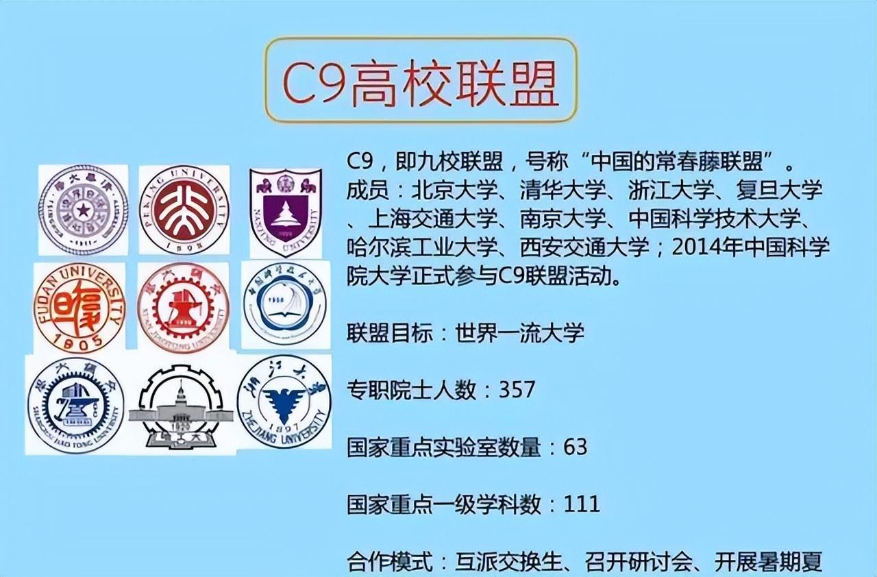 在我国现有的高校资源中,含金量和认可度最高的是985工程,985工程启动于1999年,首批入选985工程的只有九所大学,除了清华和北大外,还有上海交通大学、复旦大学、浙江大学、中国科学技术大学、南京大学、哈尔滨工业大学、以及西安交通大学,这九所大学并称为C9联盟高校。