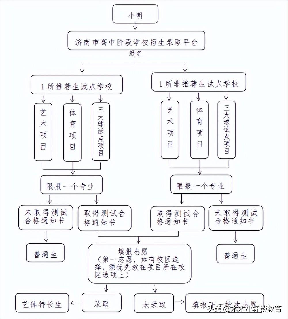 注:以上流程图仅做济南考生(不含莱芜区、钢城区)的参考,具体报名、录取按照《2022年济南市普通高中学校招收艺体特长生工作方案》执行。