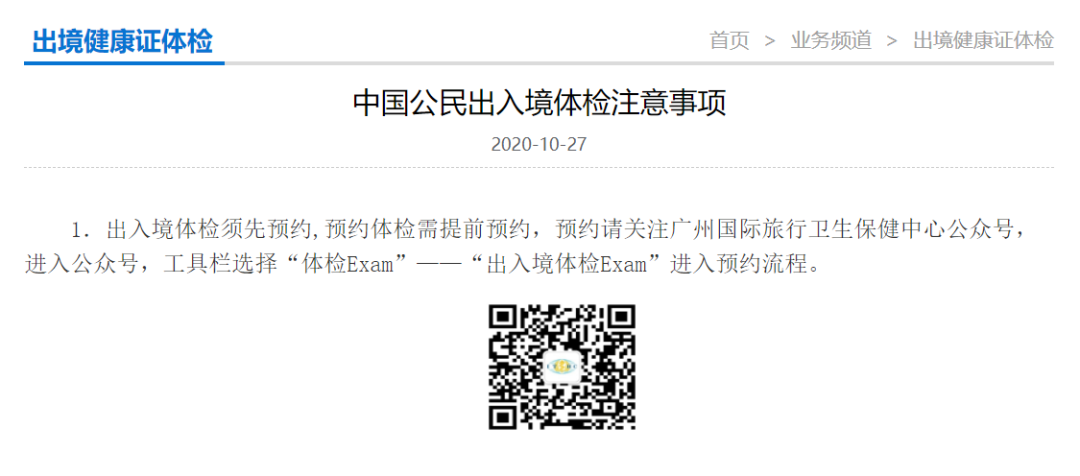 预约请关注微信公众号“广州国际旅行卫生保健中心”,进入公众号,工具栏选择“体检Exam”——“出入境体检Exam”进入预约流程。